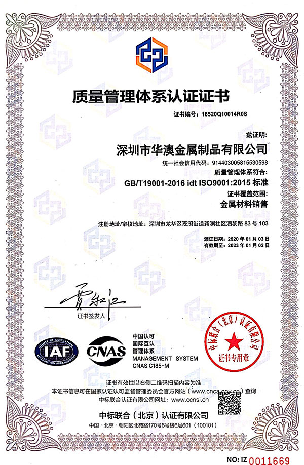 深圳市華澳金屬制品有限公司成立于2011年,擁有20多人的研發(fā)團隊,10+年專注金屬原材料生產(chǎn)經(jīng)驗,主打產(chǎn)品系列包含:鋁合金系列、不銹鋼系列、鈦合金系列,并通過ISO質(zhì)量管理體系認證9001:2015,產(chǎn)品符合“SGS"、"RoHS"環(huán)保認證。
